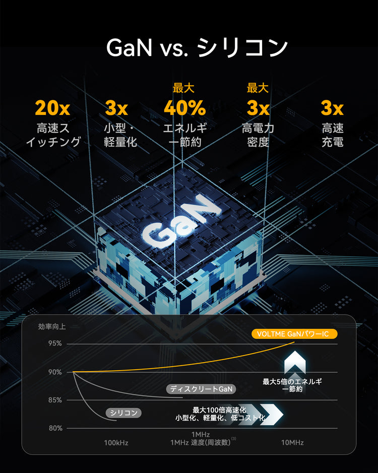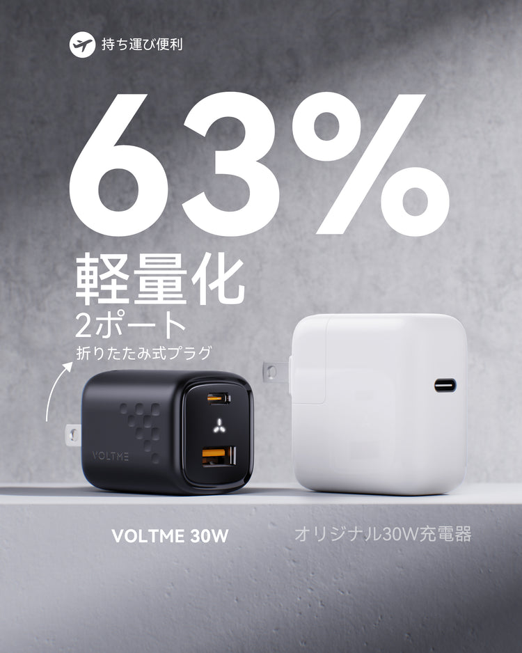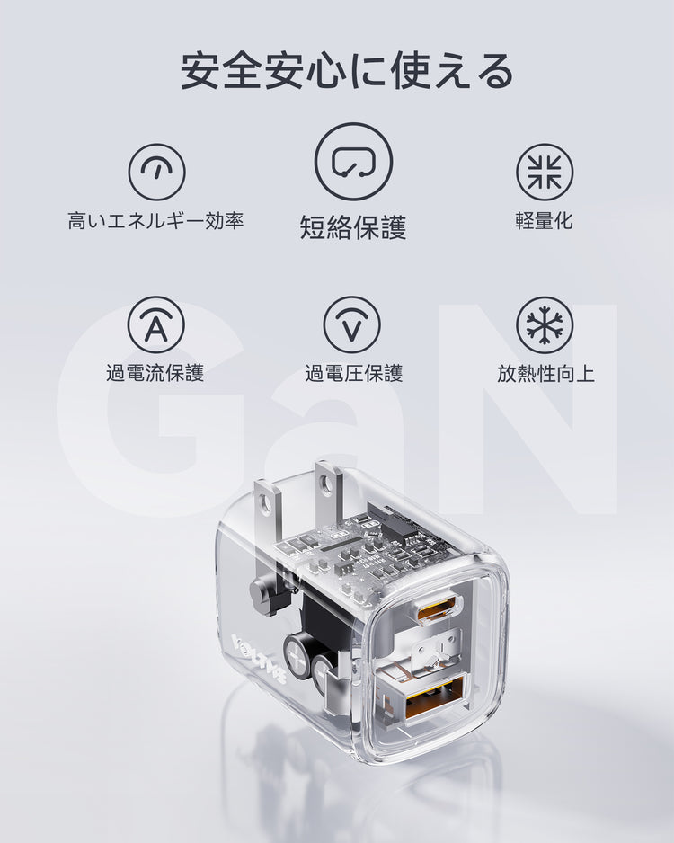 次世代半導体のGaNチップを採用で充電器本体の発熱を抑えつつ、極限の小ささを実現(純正のMacBook Air充電器より63%軽量化)。単ポート最大出力30Wで、充電の速さと小ささを兼ね備えたPD充電器です。