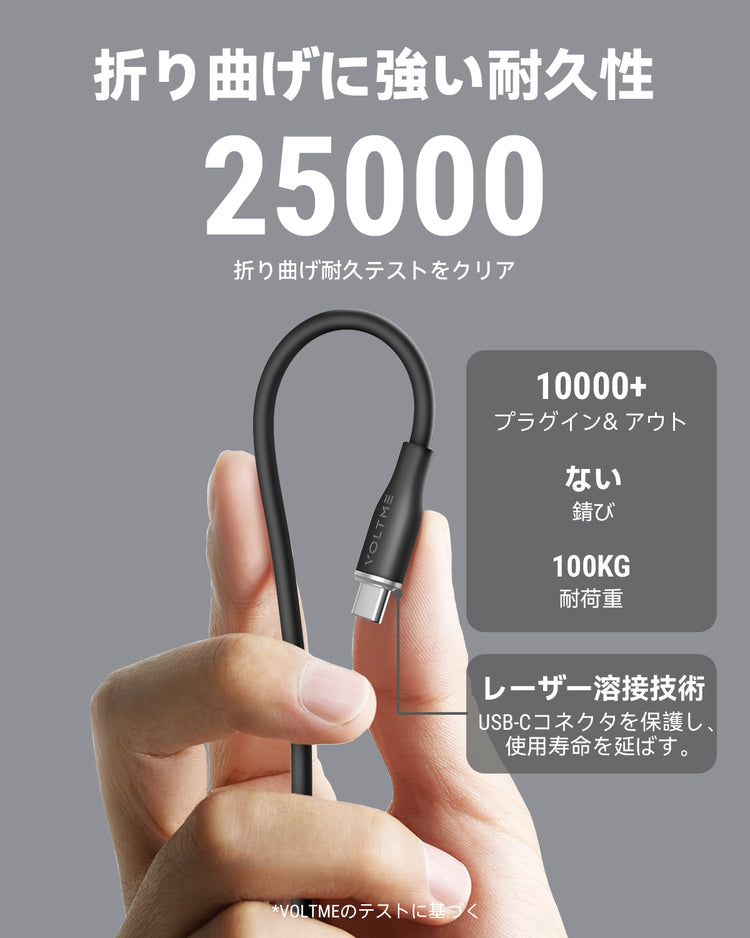 2,5000回の折り曲げテストを実施したVOLTME USB ケーブルは一般的なケーブルより5倍以上の持続力を持ちます。断線の心配なく長くご愛用いただける商品です。