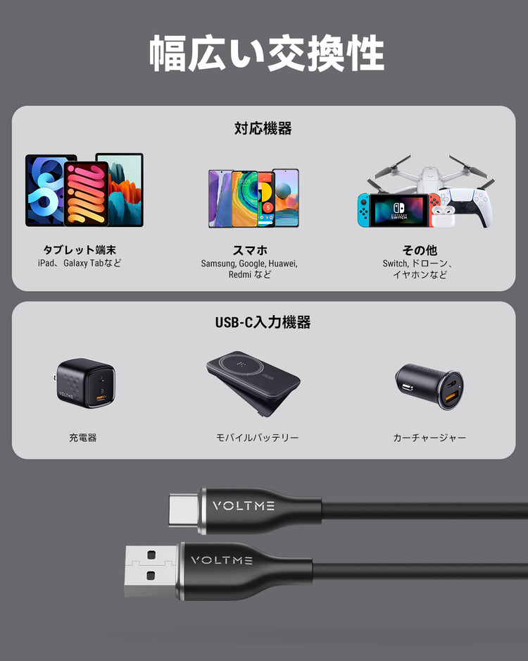 VOLTME USB-A & USB-C ケーブル - 柔らかくて絡まず、高い耐久性のシリコン制