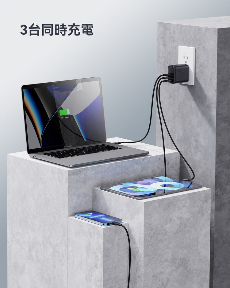 3ポート( USB-A×1 & USB-C×2)搭載で、3台同時充電可能です。ノートPCと小型デバイスを同時に充電可能です。