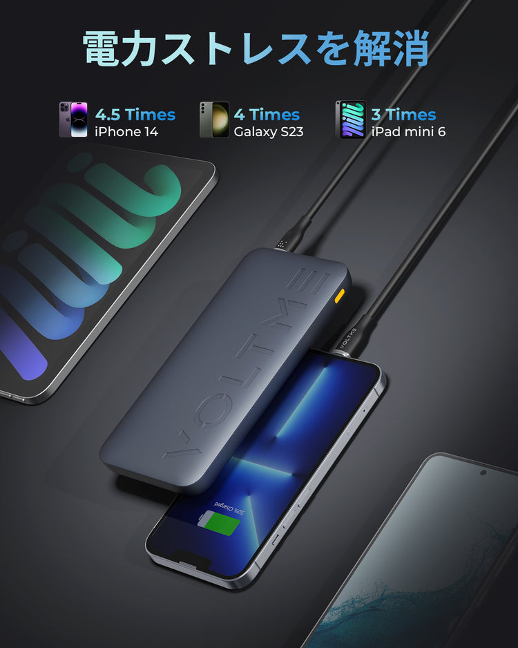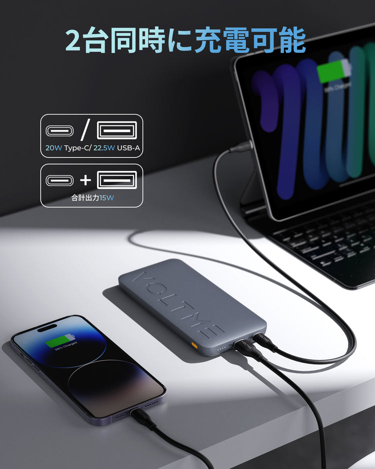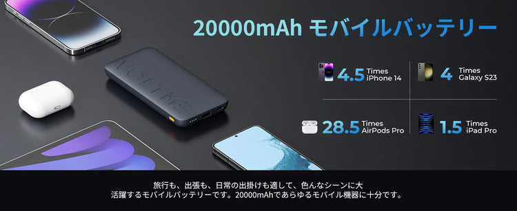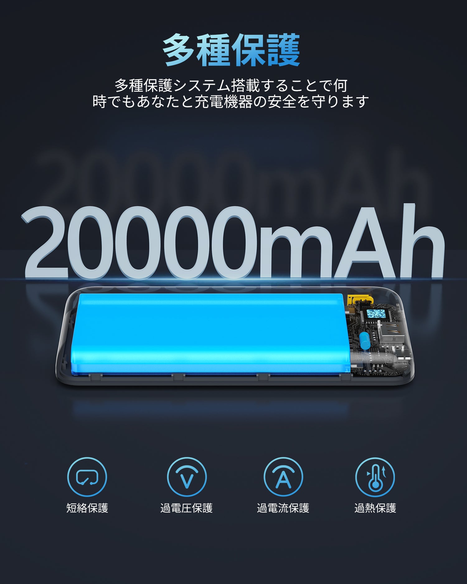 【20000mAh超大容量】20000mAhとPD 20W大容量モバイルバッテリー。一度の充電で十分な電量を供給できます。iPhone 14を4回以上、Galaxy S22を約3回、iPad mini 5を2回以上フル充電できるので長時間の外出時も安心です。
