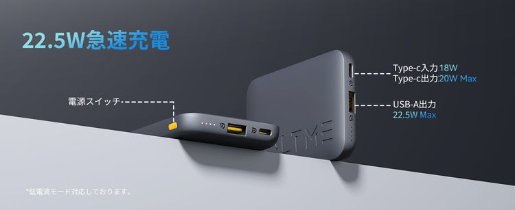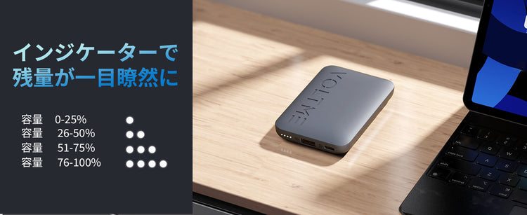 【インジケーターと低電流モード】モバイルバッテリーのインジケーターによりバッテリーの残量や使用状況を一目で確認できます。低電流モードも搭載し、イヤホン等の小型電子機器やウェアラブル機器への充電時にも最適な電流で充電できます。