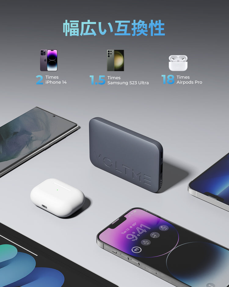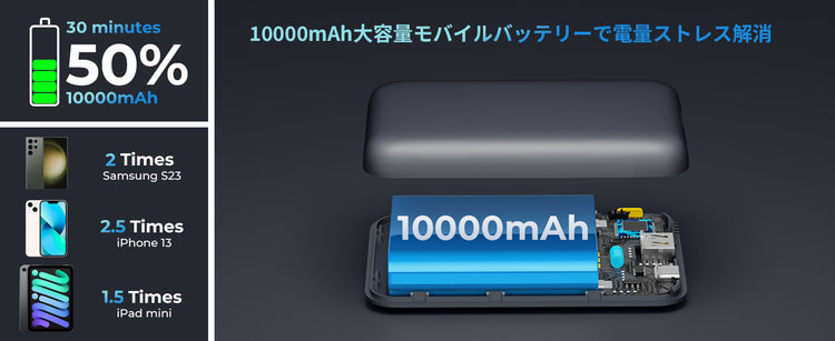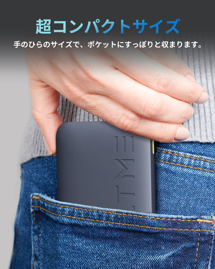 【コンパクトなのにパワフル】持ち運びに便利なコンパクトサイズながら10000mAhの大容量でiPhone 14なら2回以上、Galaxy S23なら約2回のフル充電が可能です。手のひらのサイズで、ポケットにすっぽりと収まる軽量モバイルバッテリー。国外でも使用でき、飛行機にも持ち込み可能なので長時間のフライト、海外旅行や出張にぴったりの大容量モバイルバッテリーです。