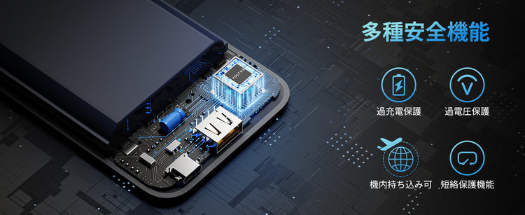 【更なる安全性の向上】独自技術V-Dynamicにより2台同時に充電する時、各ポートの出力を自動的に配分し、より効率的な充電が可能です。更に過充電/過電圧/ショート防止機能が搭載されており安全に使えます。本モバイルバッテリーはPSE技術基準に適合していますので、安心してご使用ください。