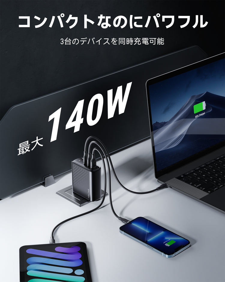急速充電を達成には、充電器、充電ケーブル、充電を行うデバイスこの三つが全部急速充電に対応する必要があります。スマホが140Wの充電に対応していません。